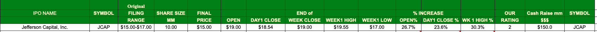 This past week, Jefferson Capital (JCAP US) priced with the buy-side in mind and rewarded investors with a four-point premium at open.