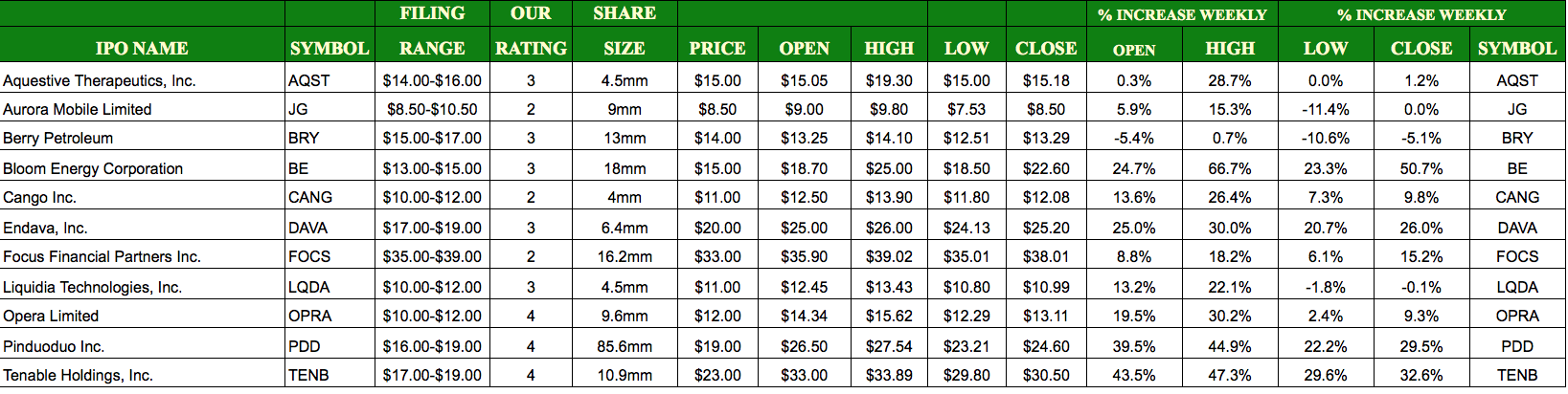 Tenable Holdings (TENB) priced 10.9mm shares at $23.00 and opened at $33.00 for a gain of 43.5% at first trade. Our sources stated that this deal ended up being 30x oversubscribed. Pinduoduo, Inc. (PDD) priced a full-size deal, 85.6mm ADSs, and opened at $26.50 for a gain of 39.5% at first trade. Opera Limited (OPRA) priced at $12.00, the high-end of the range, and opened with a first trade of $14.34 for a gain of 19.5% at first trade. Endava Inc (DAVA) upsized its offering and priced $1.00 above the range, $20.00, and opened with a first trade of $25.00 for a gain of 25%.